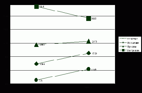Таким образом, проведенный анализ свидетельствует о том, что наибольшая доля документов как в 1999 году, так и в 2000 году приходилась на внутренние документы. Кроме того, их количество сократилось в течение года на 439 штук или 12,7 %. Данное снижение вызвано расширяющимся доступом в получении необходимой информации за счет локальной сети.